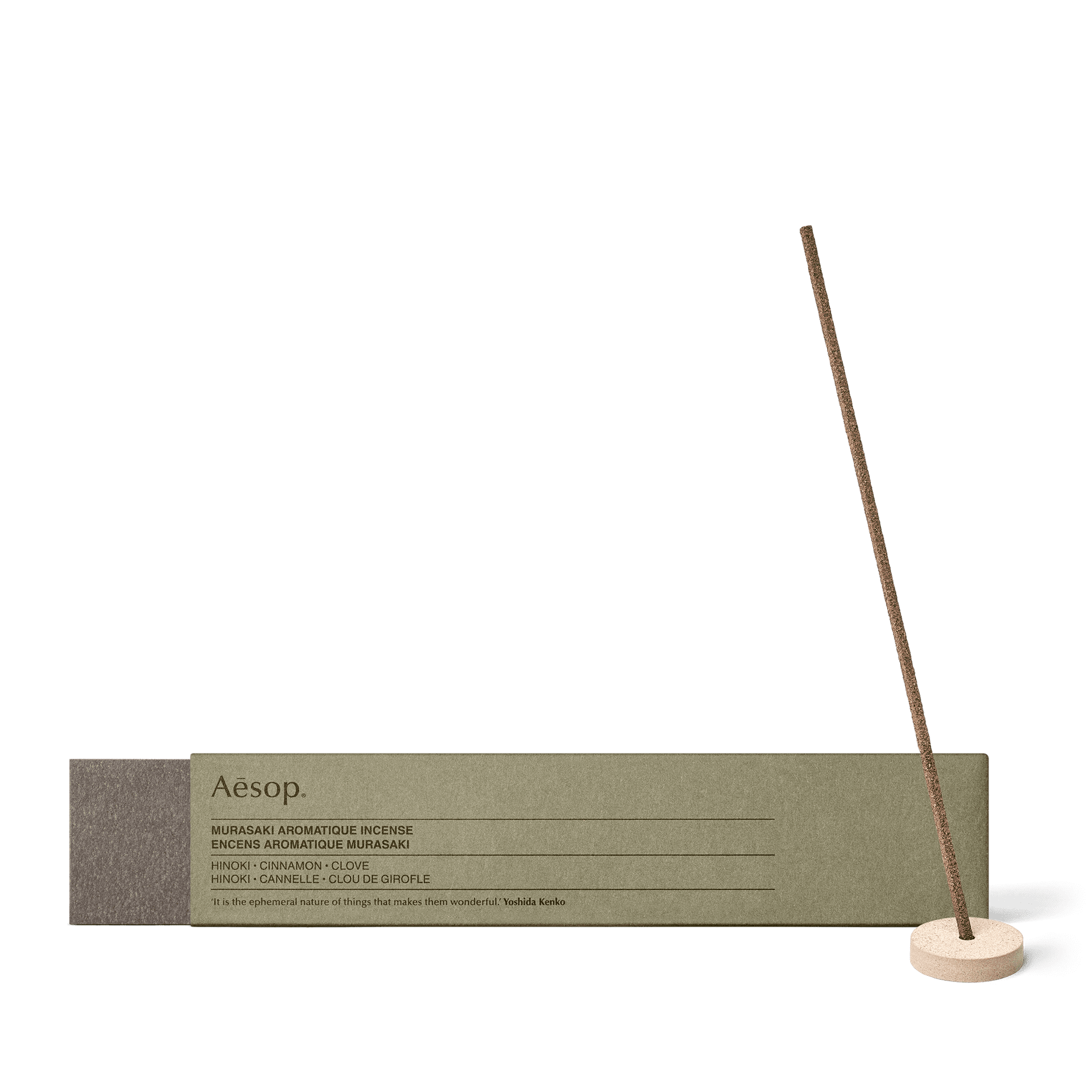 يتكون البخور من راتنجات الهينوكي الخشبية المنعشة والتوابل الدافئة التي تشتعل بلطف لترسل دخاناً عطرياَ رقيقاً. يأتي مع حامل بخور كانوما بقوام حجري.