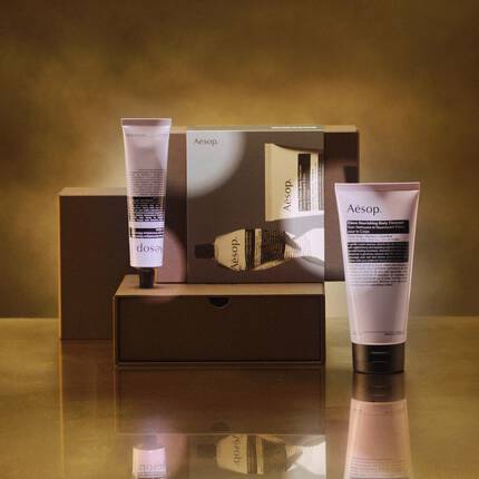 A gentle cream body cleanser and an intensely hydrating hand balm with a shared woody, spicy, herbaceous aroma.